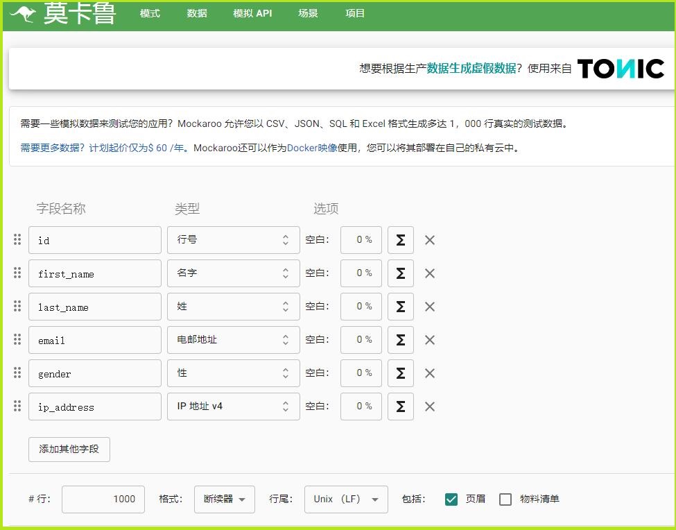 Mockaroo 测试数据生成站点。需要一些模拟数据来测试您的应用?Mockaroo 允许您以 CSV、JSON、SQL 和 Excel 格式生成多达 1000 行真实的测试数据。
